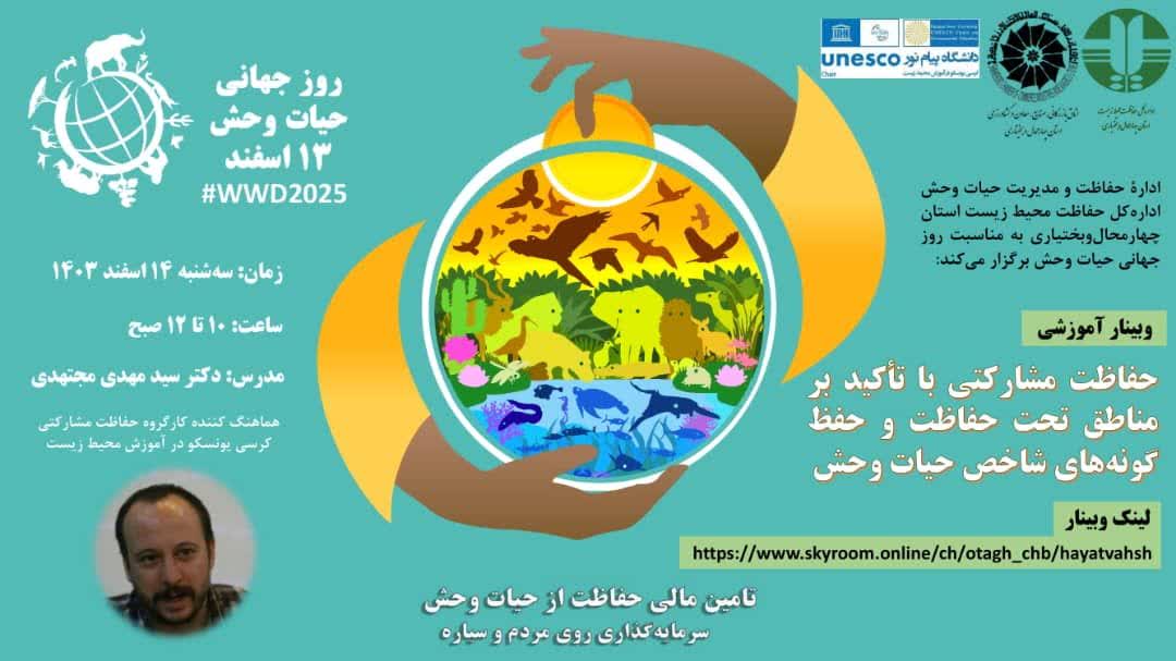 وبینار آموزشی «حفاظت مشارکتی با تاکید بر مناطق تحت حفاظت و حفظ گونه‌های شاخص حیات وحش» با همکاری اداره‌کل حفاظت محیط زیست استان چهارمحال‌وبختیاری و اتاق بازرگانی صنایع، معادن و کشاورزی این استان به مناسبت روز جهانی حیات وحش برگزار شد.
